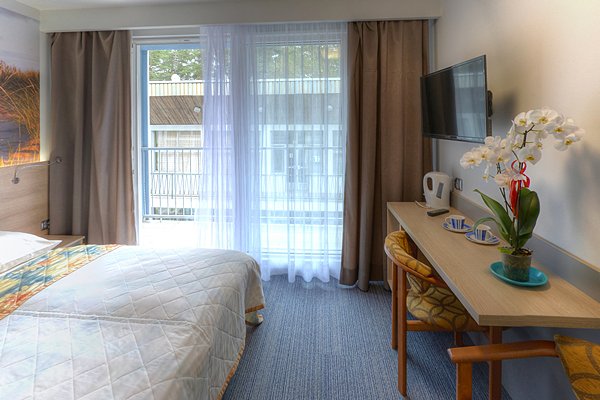 nowoczesne pokoje generalnie wyremontowane z łazienką oraz balkonem zlokalizowane na pierwszym i drugim piętrze. Każdy z pokoi w standardzie Plus wyposażony jest w dwa łóżka (z możliwością złączenia w małżeńskie), szafę oraz półki, biurko, krzesła, szafki nocne, telewizor, gniazdka na kabel USB, sprzęt plażowy (2 x leżak, parawan), suszarkę na ubrania, szklanki, talerze, sztućce. Dodatkowo w pokojach znajdą Państwo chłodziarki hotelowe, czajniki, a w łazienkach suszarki do włosów. Na wyposażeniu dostępne również ręczniki. Istnieje możliwość wstawienia dostawki.
